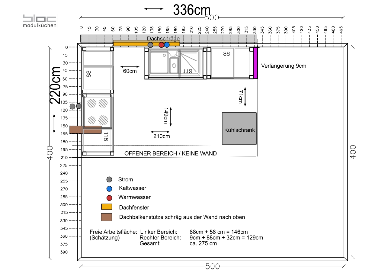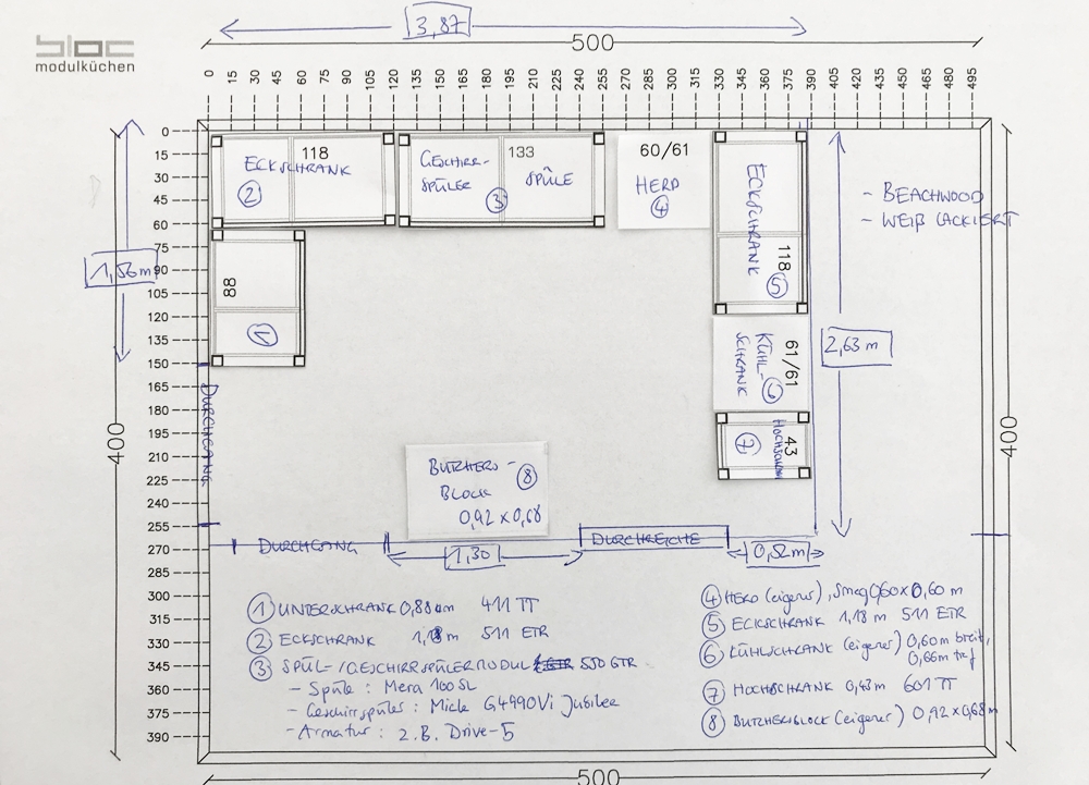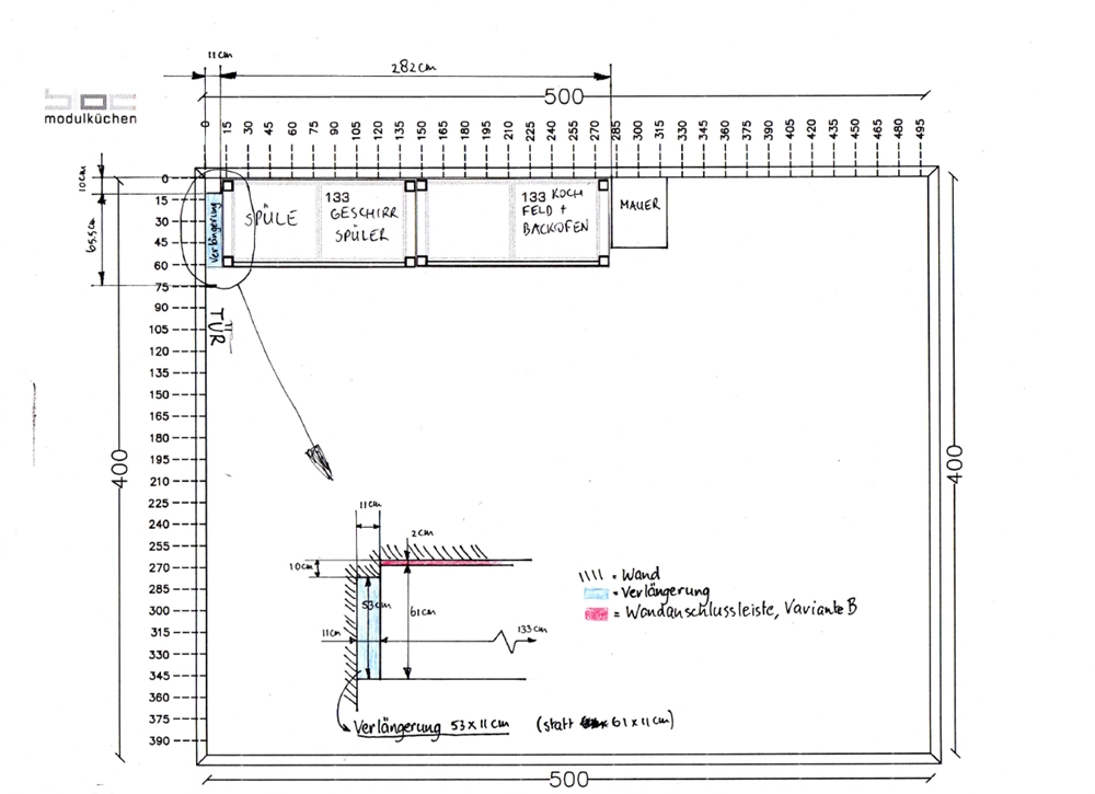 Messen Sie zuerst den verfügbaren Platz in Ihrer Küche sorgfältig aus. Zeichnen Sie den Grundriss und tragen Sie alle relevanten Details ein – inklusive: